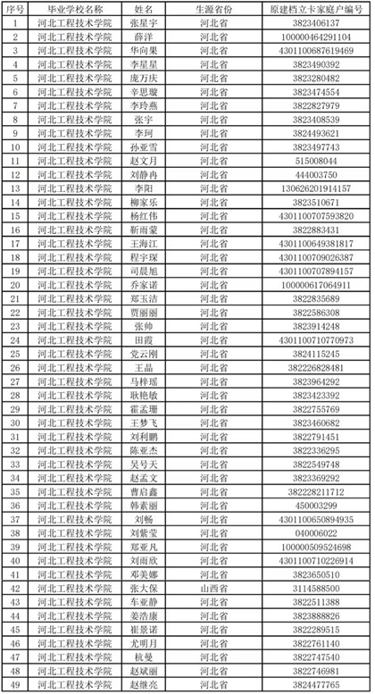 根据河北省教育厅《关于做好 2022 年河北省普通高校专科接本科教育考试选拔工作的通知》要求,现对报考“建档立卡家庭贫困生专项招生计划”的考生名单公示如下:
