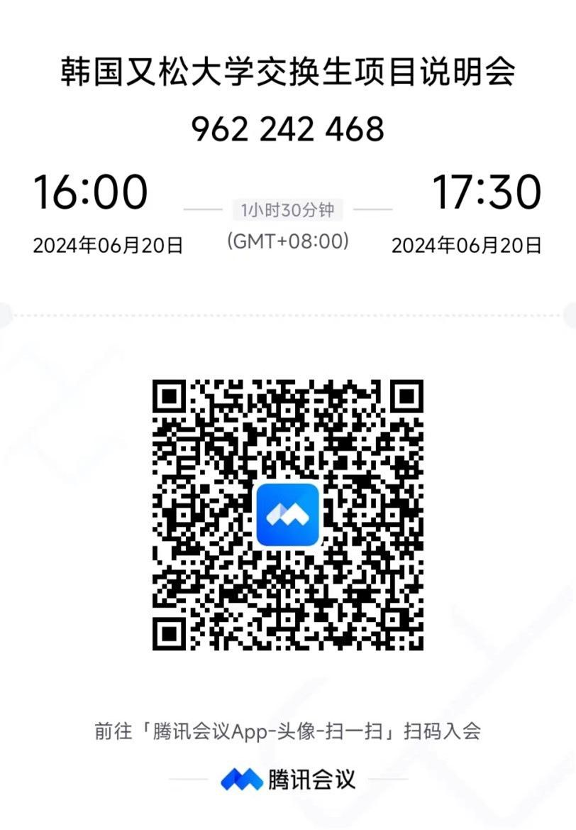 为方便学生了解又松大学情况及交换生注意事项,现于2024年6月20日下午16:00开展伟德bv国际体育与韩国又松大学交换生项目说明会(说明会为线上形式,请扫描附件腾讯会议二维码参会),会中将邀请2023年秋季赴韩国交换的学长学姐们分享他们的在韩经历,欢迎同学们积极参加。