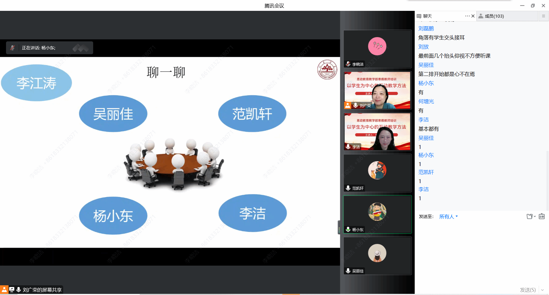 随后,刘广荣教授详细讲解了促进主动学习的实用策略。她通过互动,了解了参培教师常用的教学方法。随后深入浅出地讲解了主动学习常见的两种结构,并强调主动学习的策略体现在课堂内与外。此外,她指出老师要根据不同的互动目标,设计不同的互动方法, 而“1-3分钟作文”“结构化讨论”等教学方法可以留给学生回顾、反思的时间,促进学生主动思考。同时,她认为在运用翻转课堂教学法时,教师要在课堂互动结束后,及时进行课堂检测,收集学生对课堂的反馈评价。只有让课前、课中、课后三个环节环环相扣,才能使学生内化和外化知识,达到混合式学习的目的。