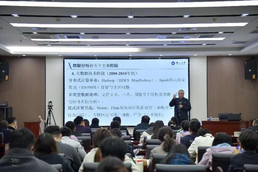 在报告中,郭教授首先系统介绍了数据分析的五个主要阶段,并详细阐述了每个阶段的发展历程及特点。随后,他深入讲解了DeepSeek大模型的基本原理、分类、发展历程及当前研究现状。结合自身的研究成果,郭教授重点探讨了DeepSeek大模型在数据分析、自然语言处理、图像识别等领域的应用,并展望了其在智能创作、人机交互等方面的未来发展趋势。最后,他强调了DeepSeek大模型应用的广泛性,鼓励教师们将其应用于学科研究、专业建设及科研项目中,通过申报科研项目、横向课题等形式,服务地方经济发展。